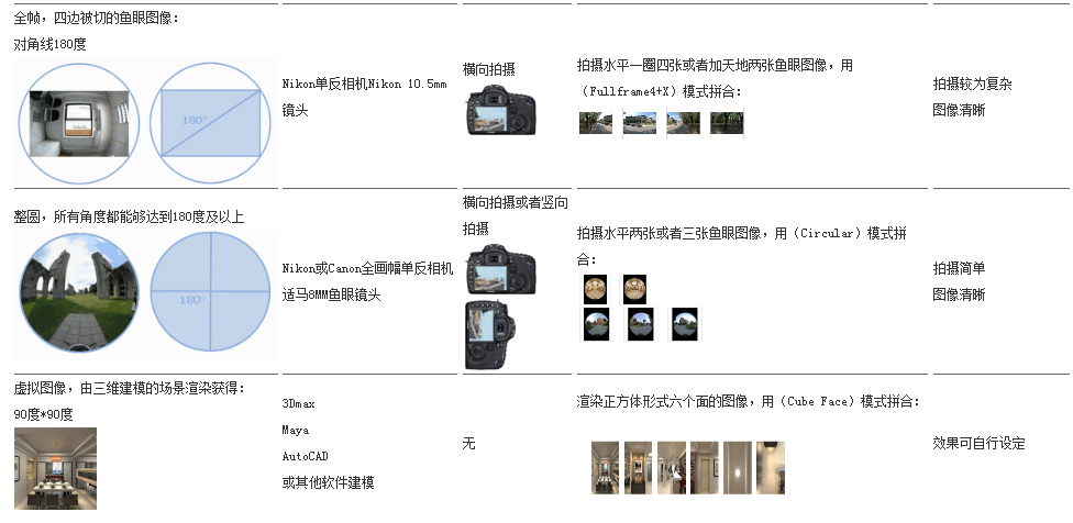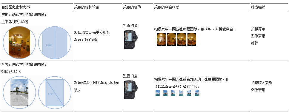 下文中的表格对比了在不同的设备、拍摄机位、拼合模式、拍摄难度下所能获得到的鱼眼图像: