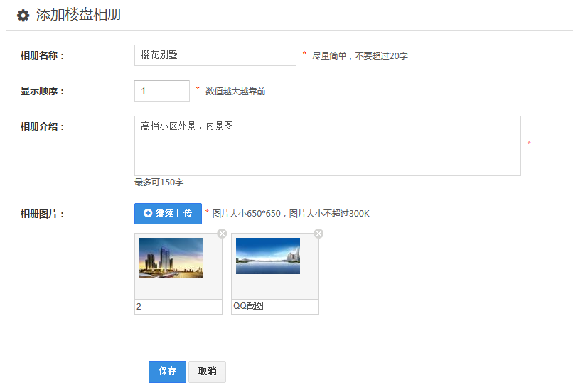 1、点击“添加相册“,进入”添加楼盘相册“界面,设置相册名称、显示顺序、相册介绍、添加相册图片,点击保存;