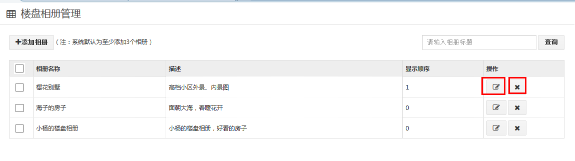 2、在“楼盘相册管理“界面,点击以下两个按钮,分别进行编辑和删除操作;)