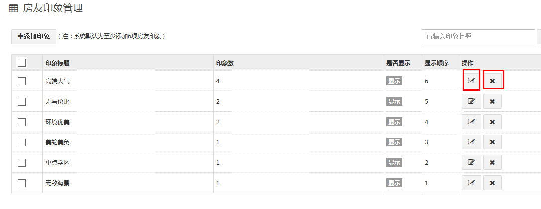 1、进入“房友印象”管理界面,点击“添加印象”,添加标题:添加能代表您楼盘特点的印象短语,如“无敌海景”、“美轮美奂”、“成熟学区”等,为保证显示效果完美,请您添加6条印象短语并且每天短语字数相同(4个字最好)。