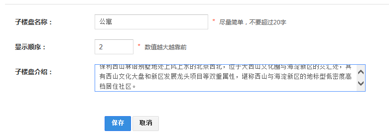 1、点击“添加子楼盘”,设置子楼盘名称,显示顺序、子楼盘介绍,点击保存;
