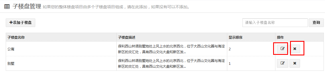 “子楼盘”:如果您的楼盘是由多种楼盘类型组成的,比如既有别墅群,又有公寓、商品房等,那我们建议您在子楼盘内进行分类添加相应的子楼盘。