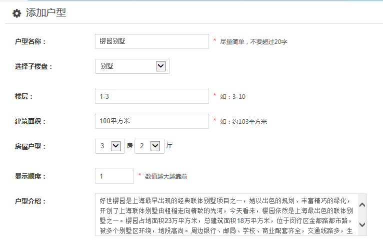 1、点击“添加户型”,设置户型名称、选择子楼盘、楼层设置、建筑面积、房屋户型、显示顺序、户型介绍,添加户型图片,点击保存;
