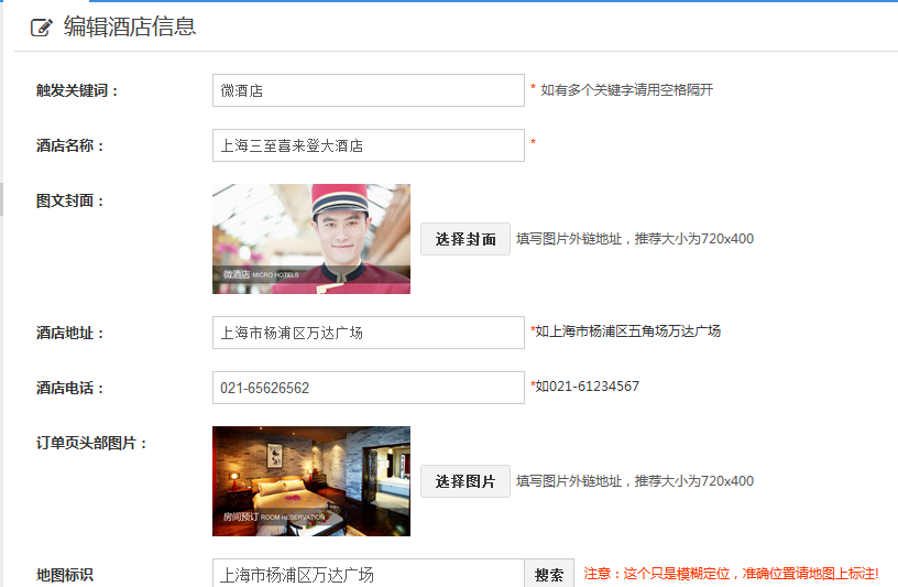 1、点击新建订房,进入编辑酒店信息页面,设置触发关键词、酒店名称、上传图文封面、填写酒店地址、酒店电话、上传订单页头部图片、设置地图标识,以实现一键导航功能;