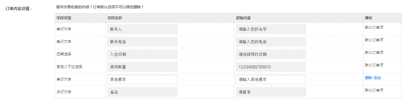 4、订单内容设置:例如:联系人、联系电话、预约日期、选择数量,商家可以根据自己的需求,可对酒店各房间的类型、价格、图片、配套设施进行填写,以供用户针对性的选择房型预订,点击保存