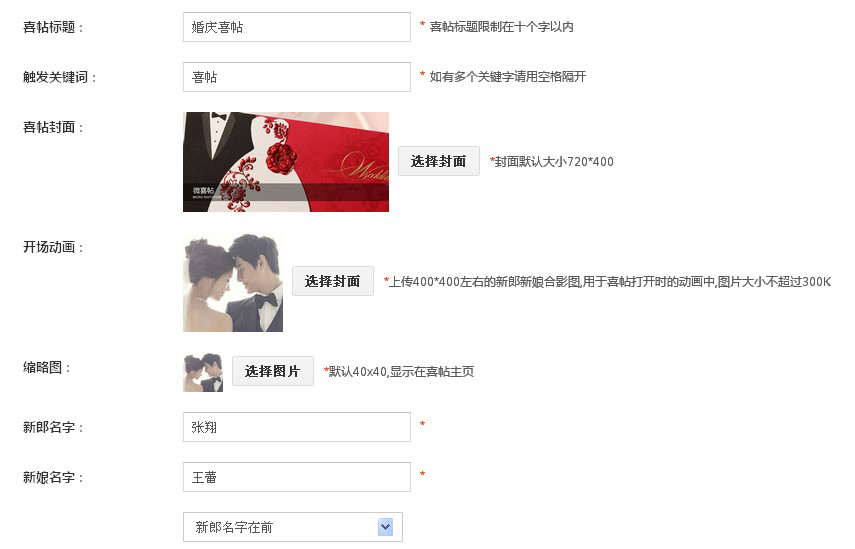 1、首先,添加喜帖,设置喜帖的标题,以及触发的关键字,上传喜帖的图文封面和开场动画的封面、喜帖主页的小图标,填写新浪新娘的名字,联系电话、婚庆日期、婚庆地点;