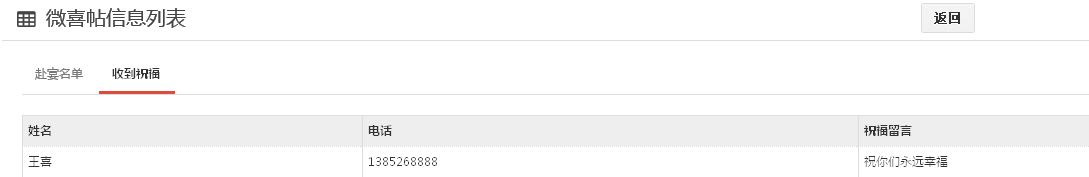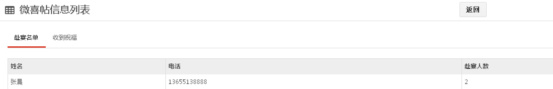 1、点击上图所示的图标,进入信息列表界面,可以查看赴宴名单和收到的祝福: