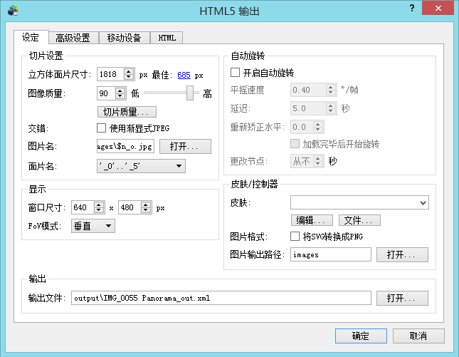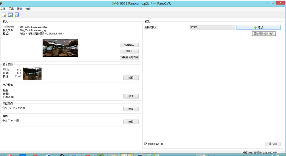 在上图中,点击“选择输入”,将第二步生成的全景图片导入进去;同时点击“新输出格式”的下拉框,选择“HTML5”选项,然后点击“增加”按钮如图